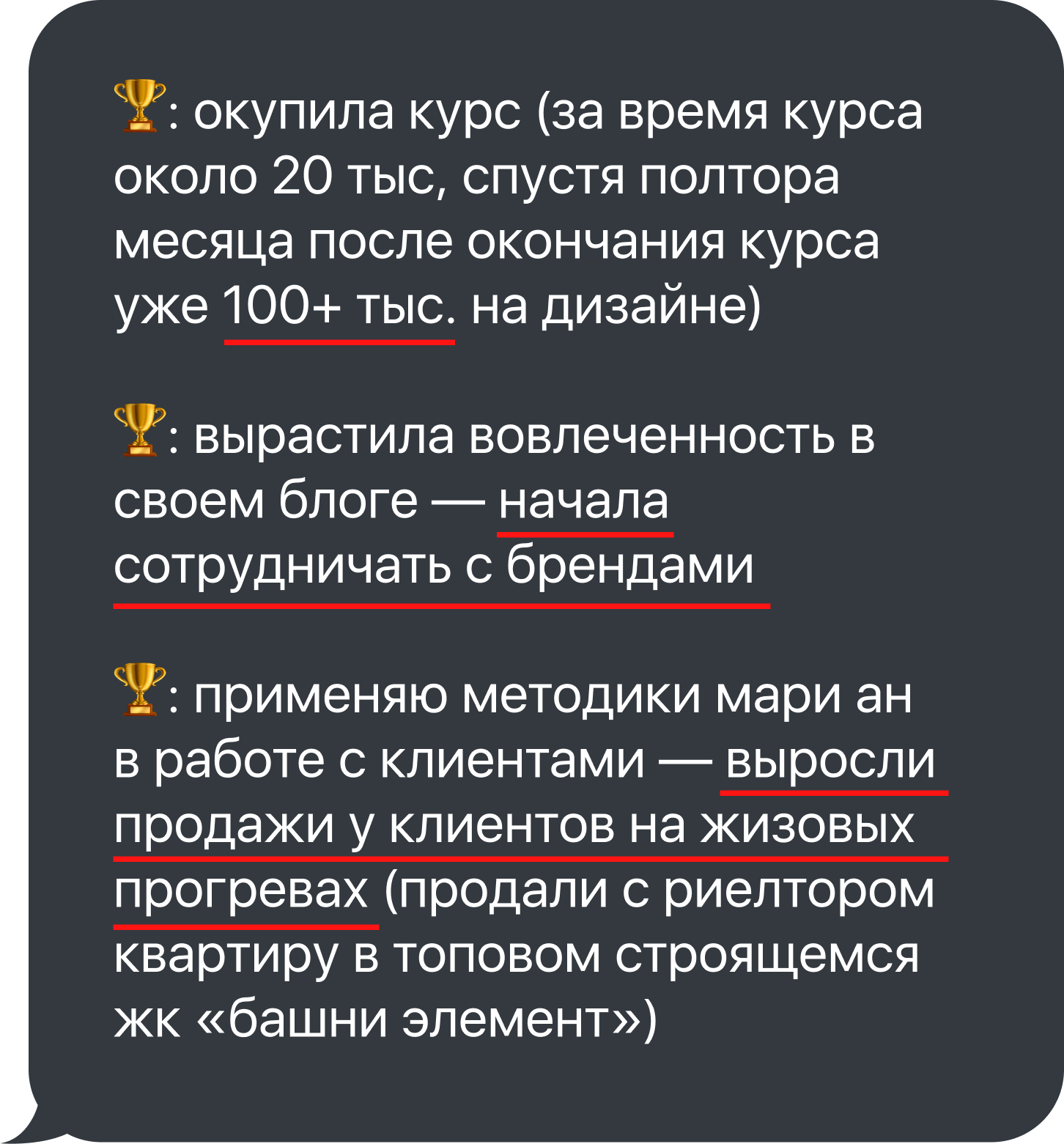 - сертификат - возможность заявить в блоге и заказчикам, что ты проходил курс Мари Ан. Это повышает доверие.