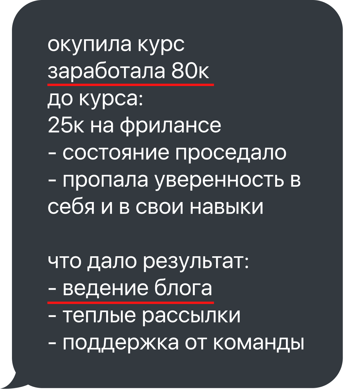 - сильная обратная связь на твой блог, прогревы, созвоны, презентации для вебинаров и тд